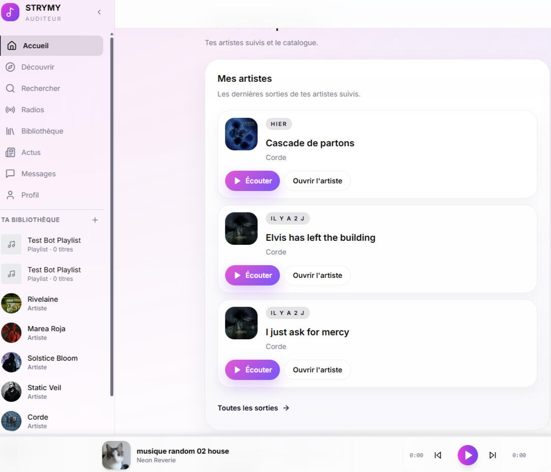 Artistes, auditeur·ices ou pros, vous ne venez pas ici pour “consommer un service”, mais pour nous aider à construire un circuit court musical plus juste.Concrètement, on attend de vous :que vous testiez STRYMY dans votre vraie vie (projet en cours, écoutes, travail avec des artistes) ;que vous nous fassiez quelques retours honnêtes sur ce qui marche, ce qui bloque, ce qui manque ;que vous acceptiez que tout ne soit pas parfait tout de suite, mais que votre avis pèse vraiment sur la suite.